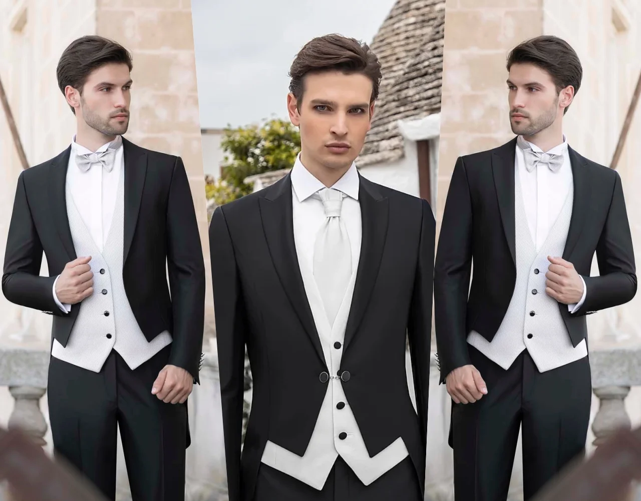 Tessuti pregiati e morbidi delle migliori aziende tessili italiane si traducono in proposte classiche come smoking e frac, per uno sposo dallo stile elegante, ma attento ai dettagli, in un perfetto equilibrio tra tradizione sartoriale e tendenza moda.